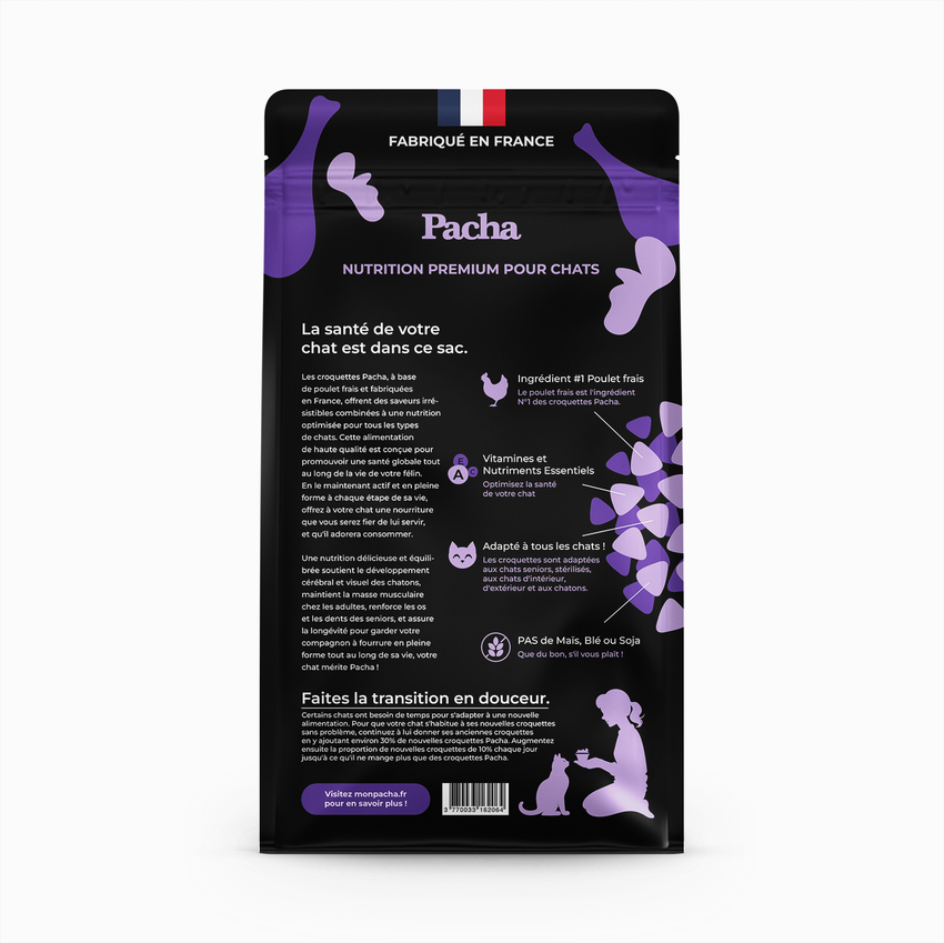 Après la litière Pacha, nous avons décidé d'aller plus loin en créant notre propre recette de croquettes. Nos croquettes contiennent du poulet frais et d'autres ingrédients de haute qualité. Elles sont produites en France et respectent les plus hautes normes de qualité disponibles.