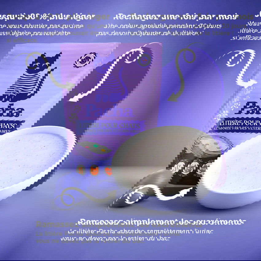 La litière Pacha™ élimine instantanément l'humidité et piège les odeurs pour que vous ne sentiez plus jamais les petites affaires de votre chat. De la nouvelle litière fraîche est directement livrée à votre porte tous les mois. Plus besoin d'ajouter du bicarbonate de soude ou du vinaigre blanc pour éliminer les odeurs. Abandonnez les litières minérales et végétales et passez à la litière en gel de silice !